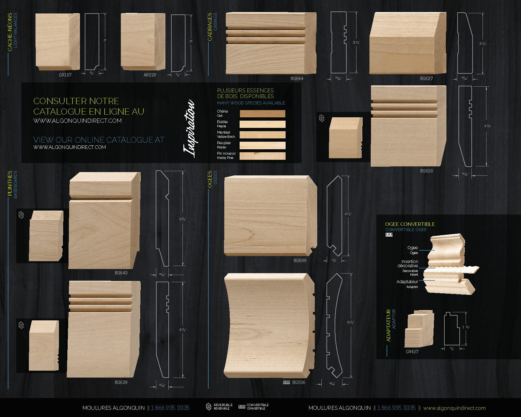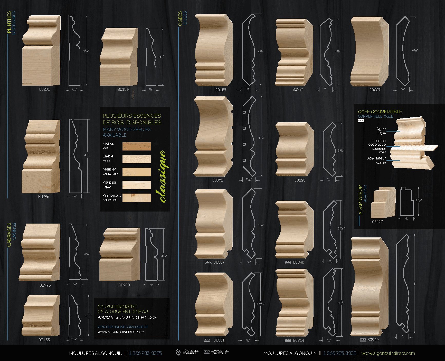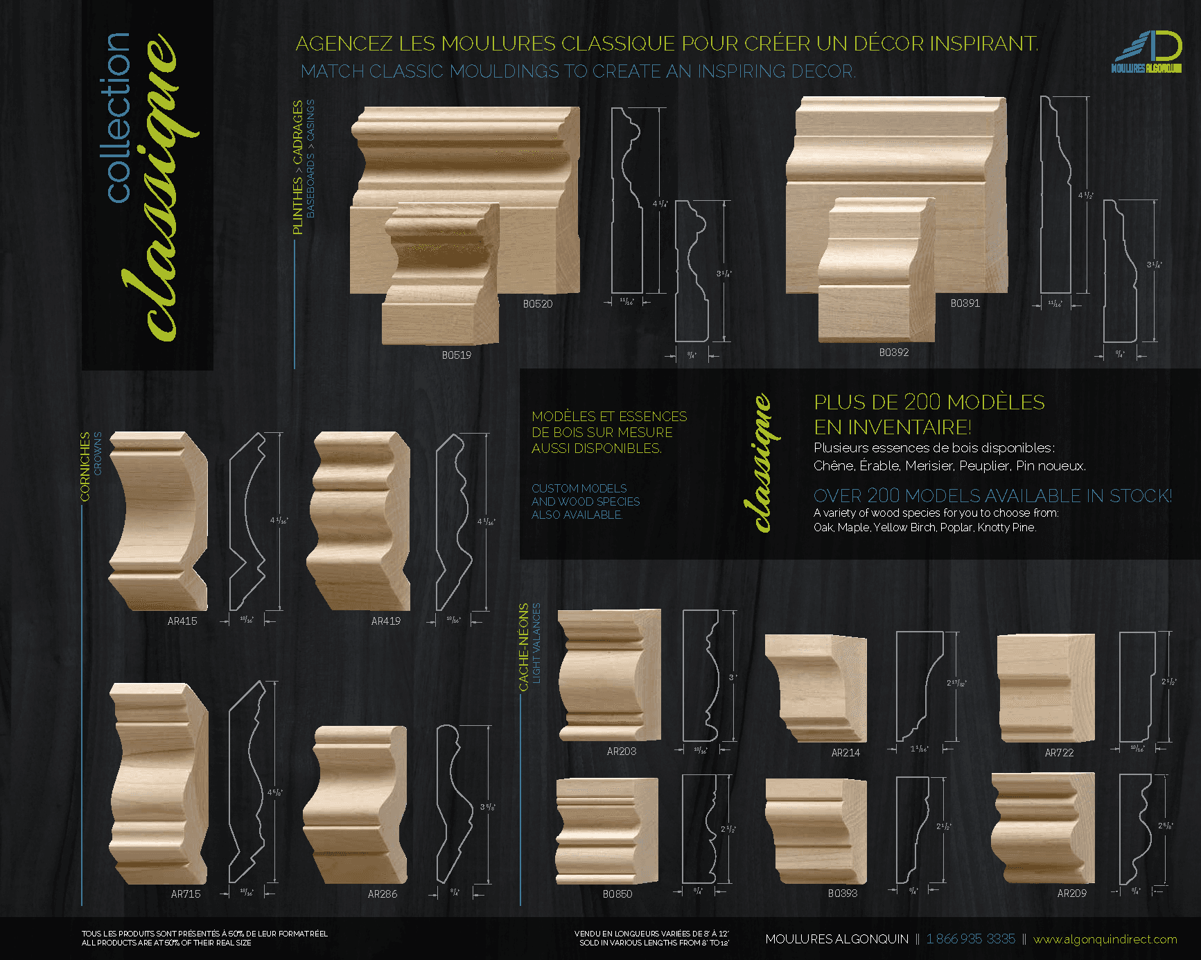 Boiseries Algonquin comprend l’importance de la finition dans la fabrication d’armoires de cuisine. Nos boiseries et moulures en bois, conçues pour les fabricants d’armoires, offrent non seulement une esthétique raffinée, mais aussi une fonctionnalité supérieure. Nos produits incluent :