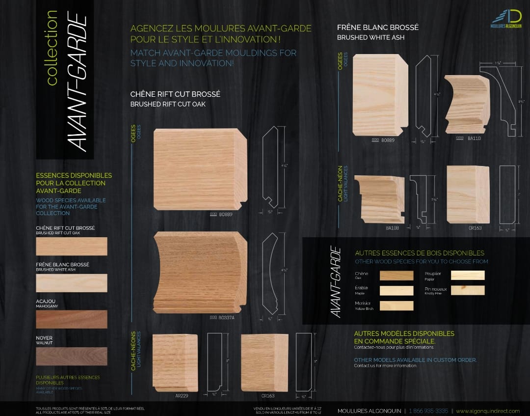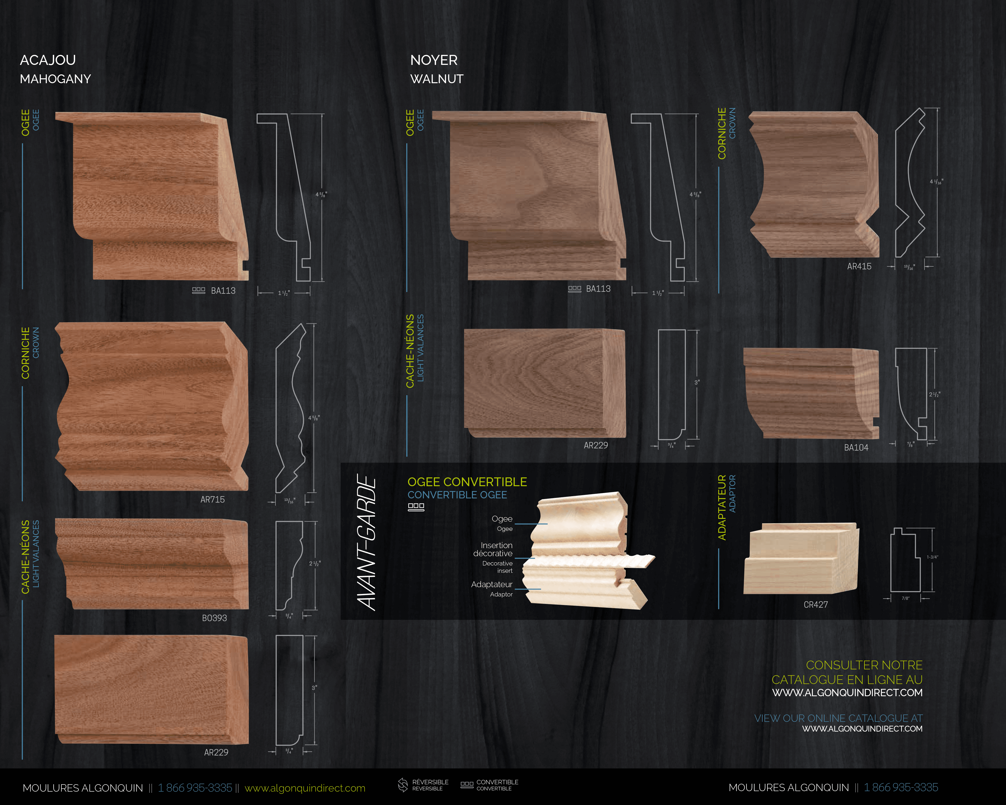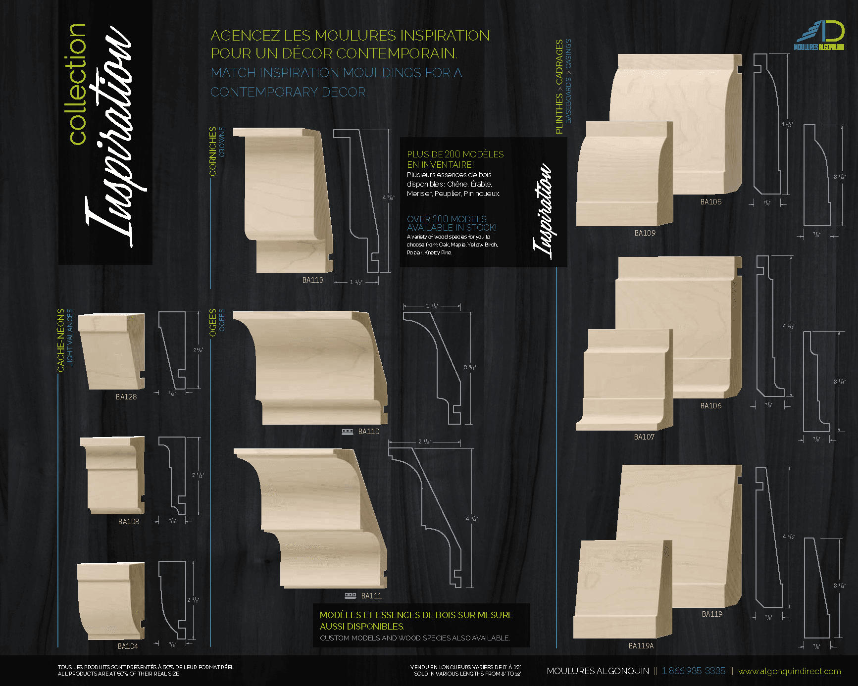 Boiseries Algonquin comprend l’importance de la finition dans la fabrication d’armoires de cuisine. Nos boiseries et moulures en bois, conçues pour les fabricants d’armoires, offrent non seulement une esthétique raffinée, mais aussi une fonctionnalité supérieure. Nos produits incluent :